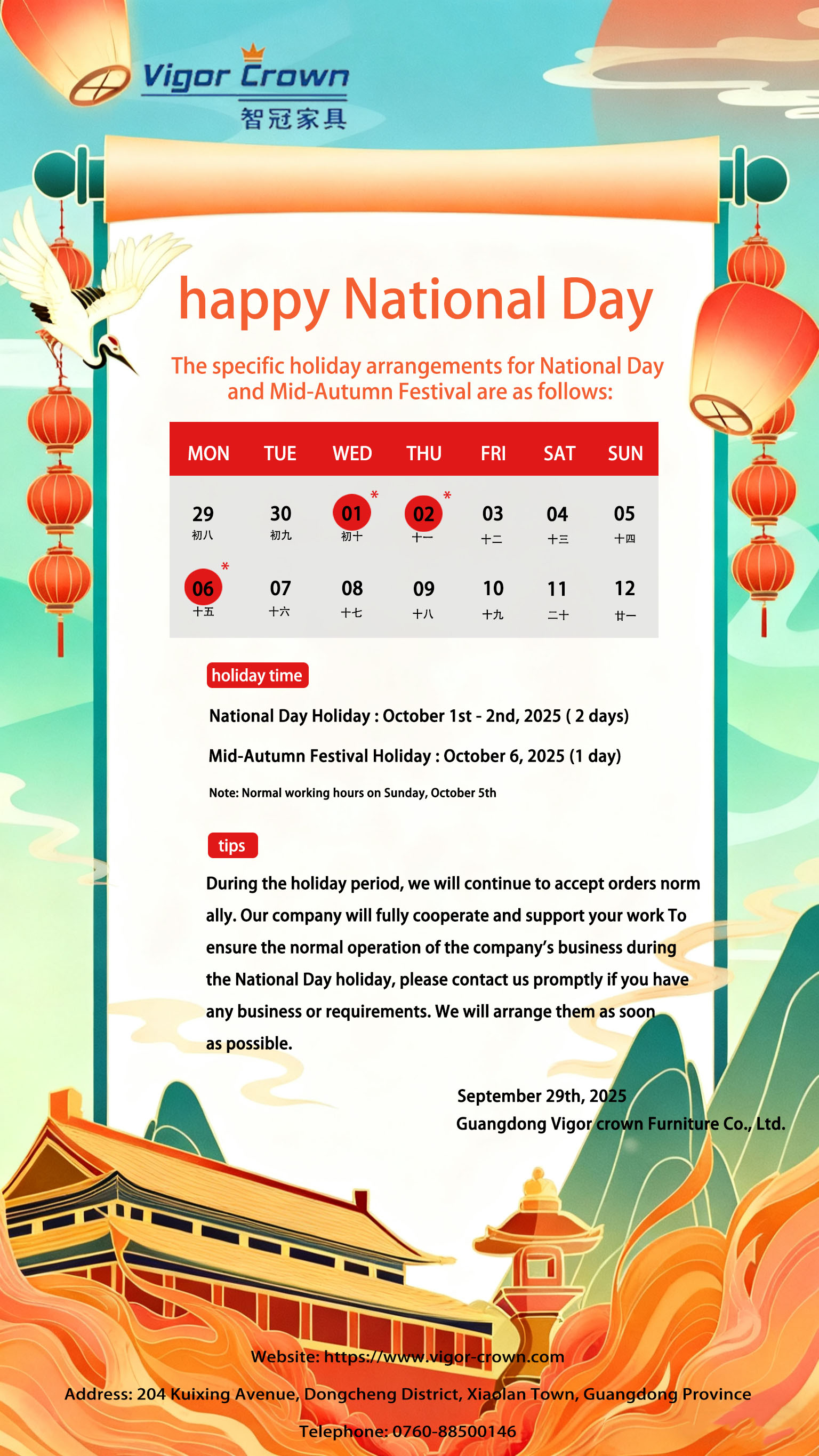 Dear valued customers:The National Day and Mid-Autumn Festival holidays are appr...